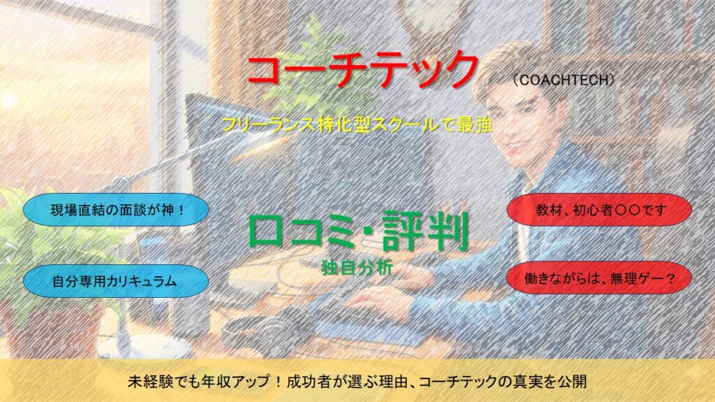 「完全未経験者が”スキル”、”開発実績”、”自信”を身につけ、最短で即戦力フリーランスエンジニアへ」、が売りのCOACHTECH(コーチテック)。カリキュラム完遂後、受講中... -